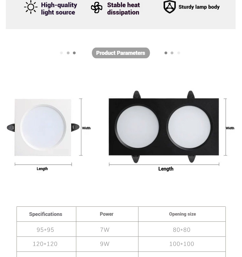 | Square single head recess | 7W | φ95mm | 80mm | Aluminum body | White/Black | 165-265V | 80 | 3000K/4000K/6000K/three color | color box +carton box |