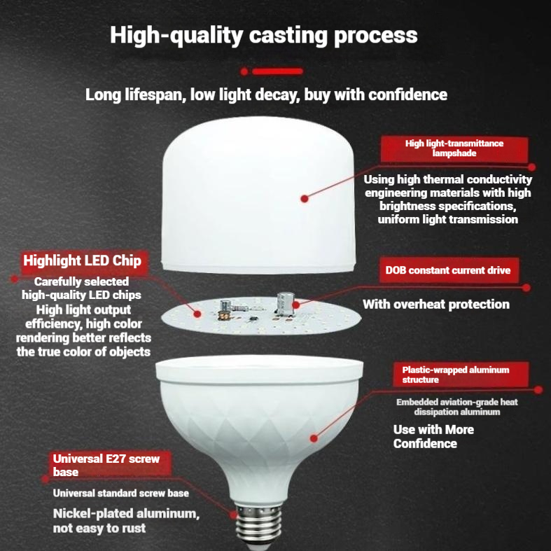 High Lumen LED T Bulb for commercial and industrial lighting are designed to provide powerful and uniform illumination. With high efficiency, long lifespan, and wide beam angles, they are ideal for warehouses, factories, supermarkets, parking areas, and large open spaces requiring reliable, high-brightness lighting.