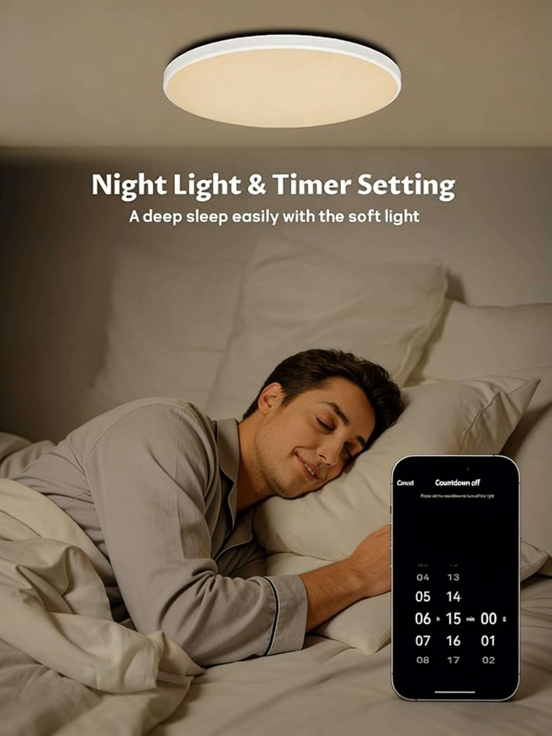 Smart LED Flush Mount Ceiling Light features a low-profile design combined with intelligent lighting control. It offers app-based dimming, adjustable color temperature, and energy-efficient LED performance. Ideal for residential, hospitality, and commercial projects where modern aesthetics, smart functionality, and easy installation are required.